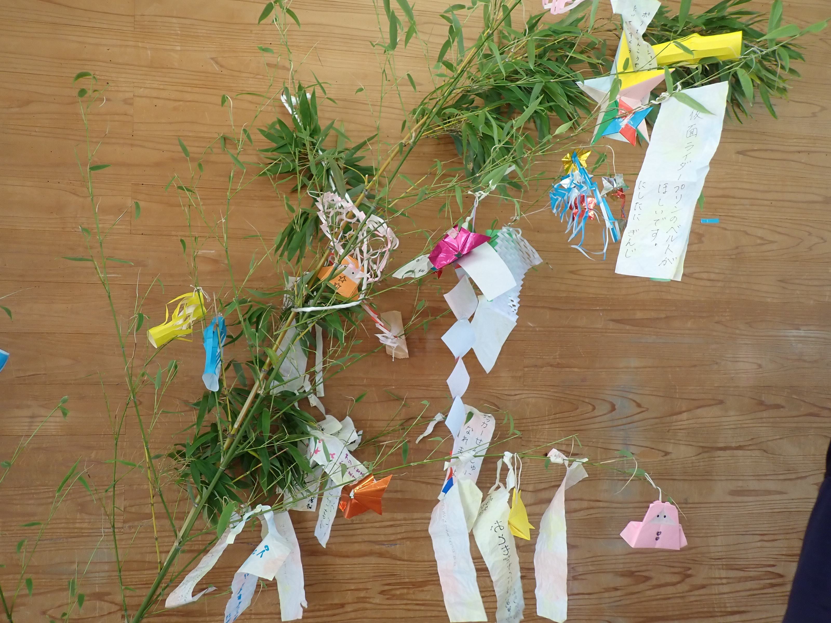 令和7年7月7日、七夕の集いを開きました。お家の人と一緒に願い事を書いた短冊や笹飾りを作って、笹に飾りました。