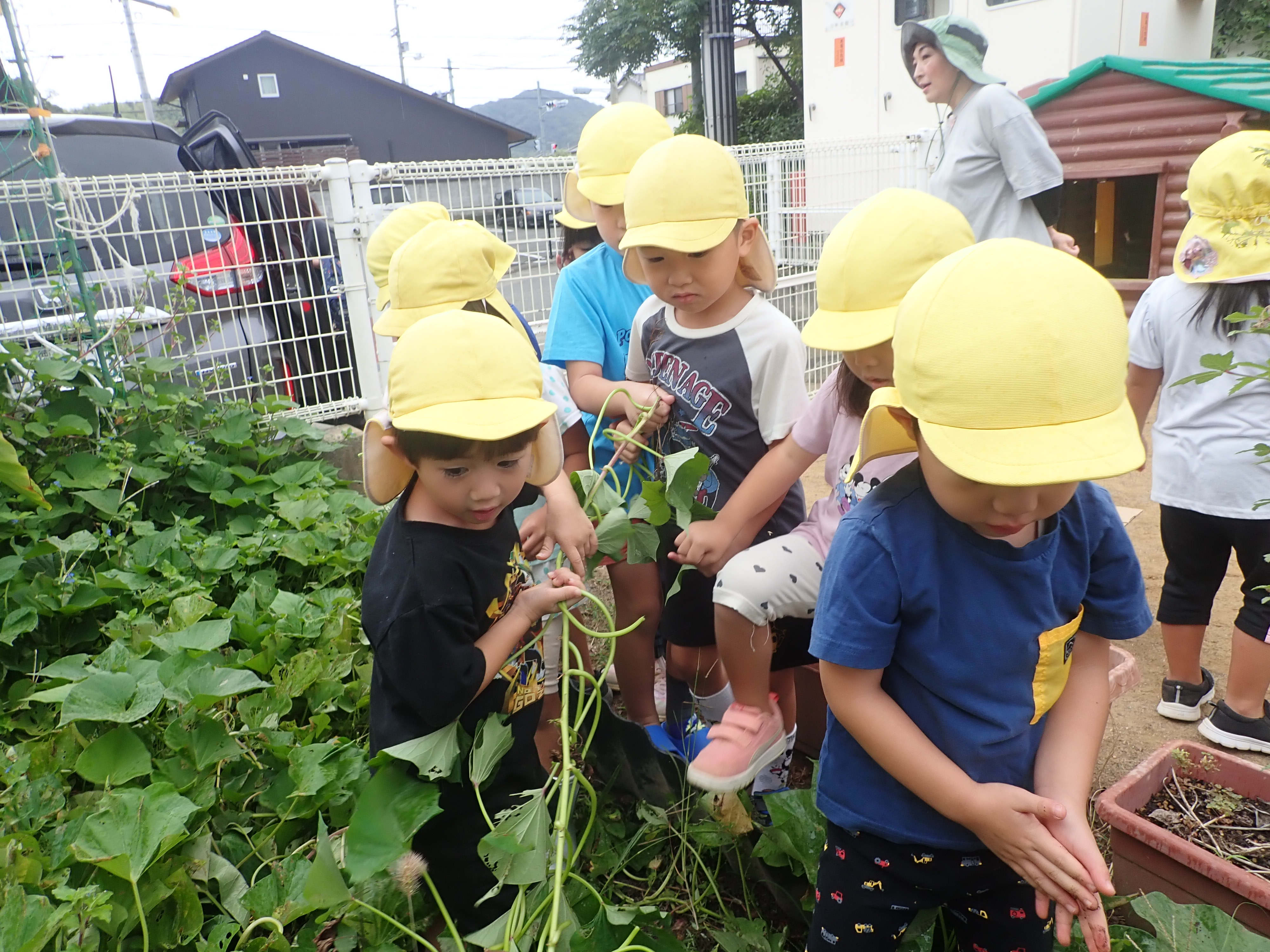 さつまいも堀りをしました。まずはつるを引っ張って!
