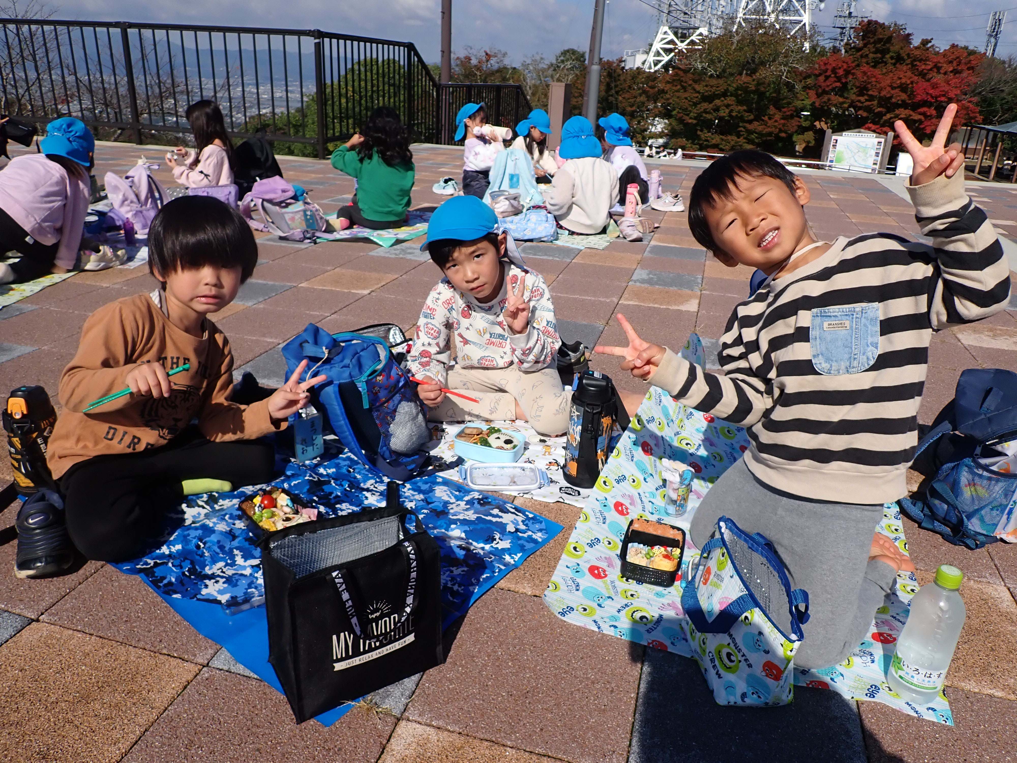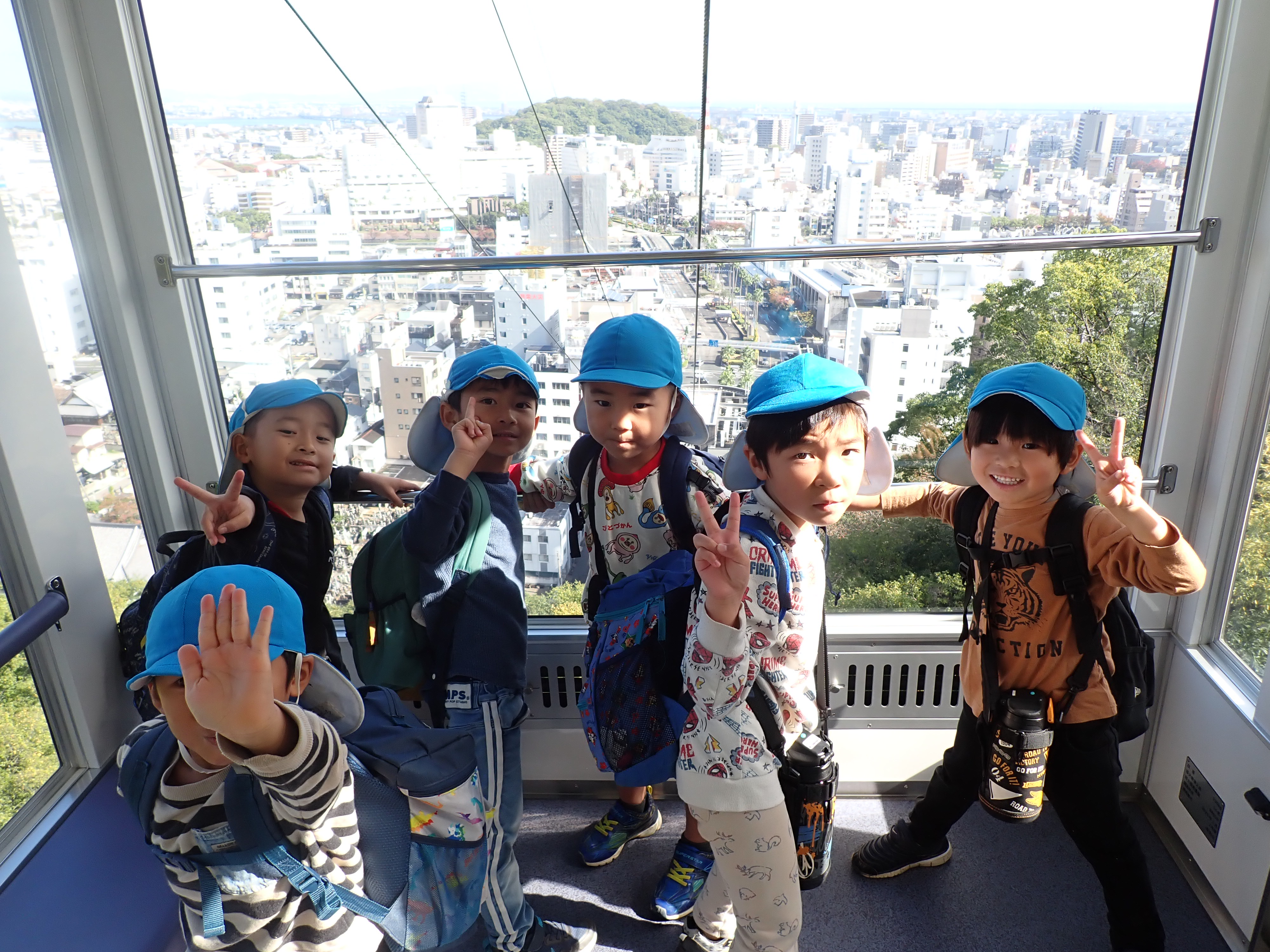 R7年11月6日、5歳児は、路線バスに乗って木で作ったおもちゃ展に出かけたよ!おもちゃ展で、それぞれに遊んだよ。ロープウエイに乗って眉山山頂まで☺全員集合「ハイ、チーズ!」お家の人が作ってくれたお弁当おいしかったよ!朝早くからご準備ありがとうございました。