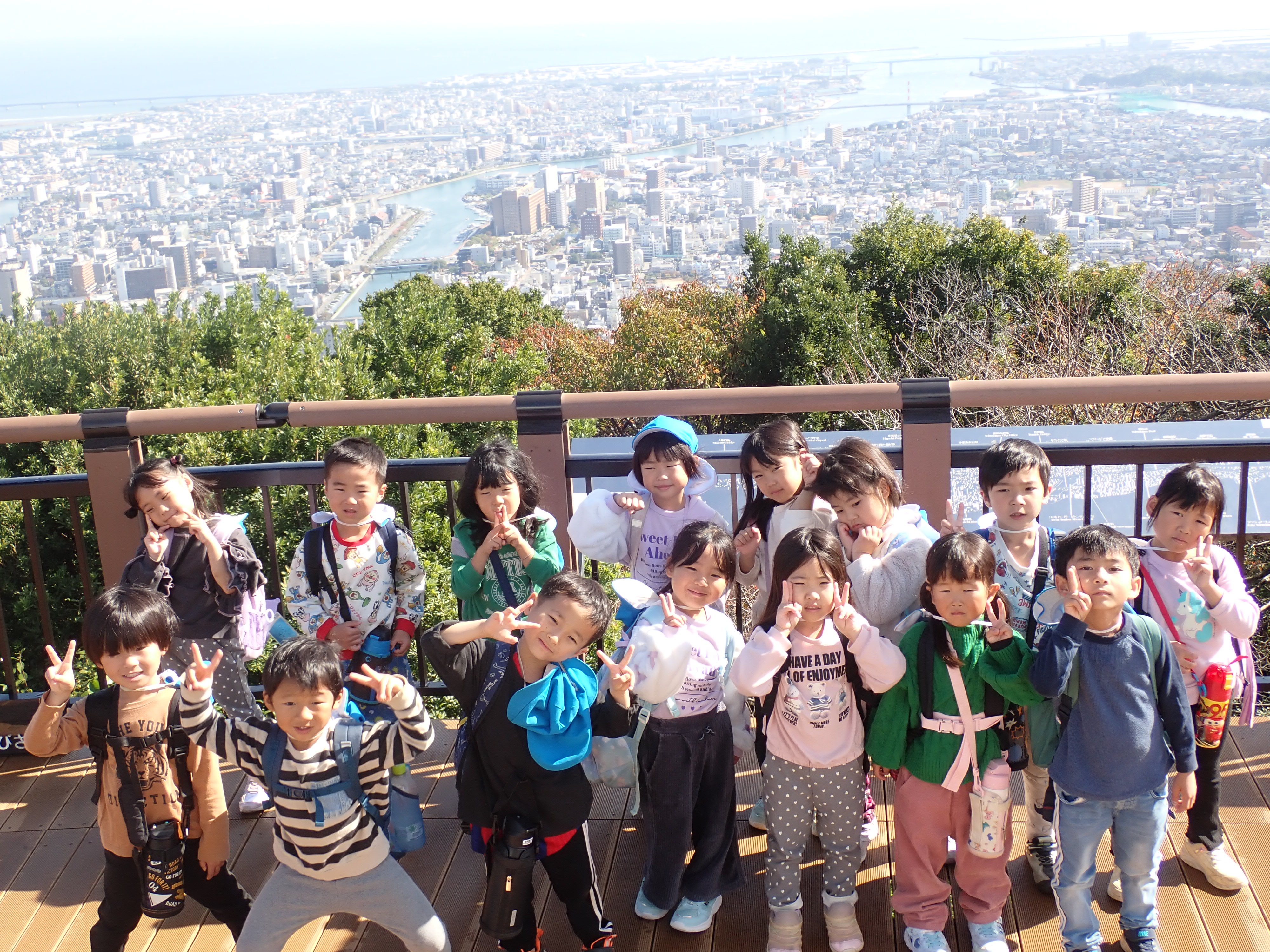 R7年11月6日、5歳児は、路線バスに乗って木で作ったおもちゃ展に出かけたよ!おもちゃ展で、それぞれに遊んだよ。ロープウエイに乗って眉山山頂まで☺全員集合「ハイ、チーズ!」お家の人が作ってくれたお弁当おいしかったよ!朝早くからご準備ありがとうございました。