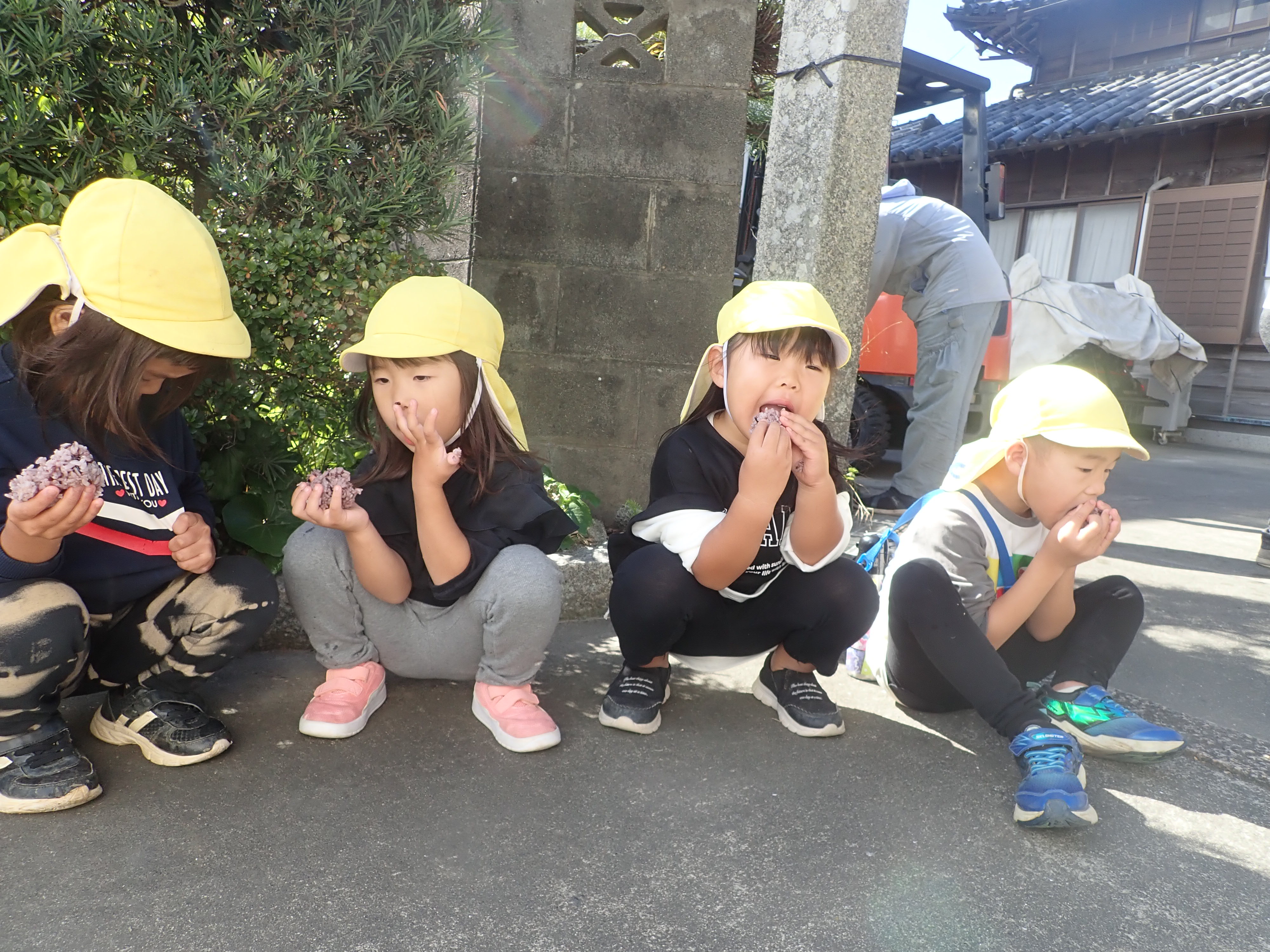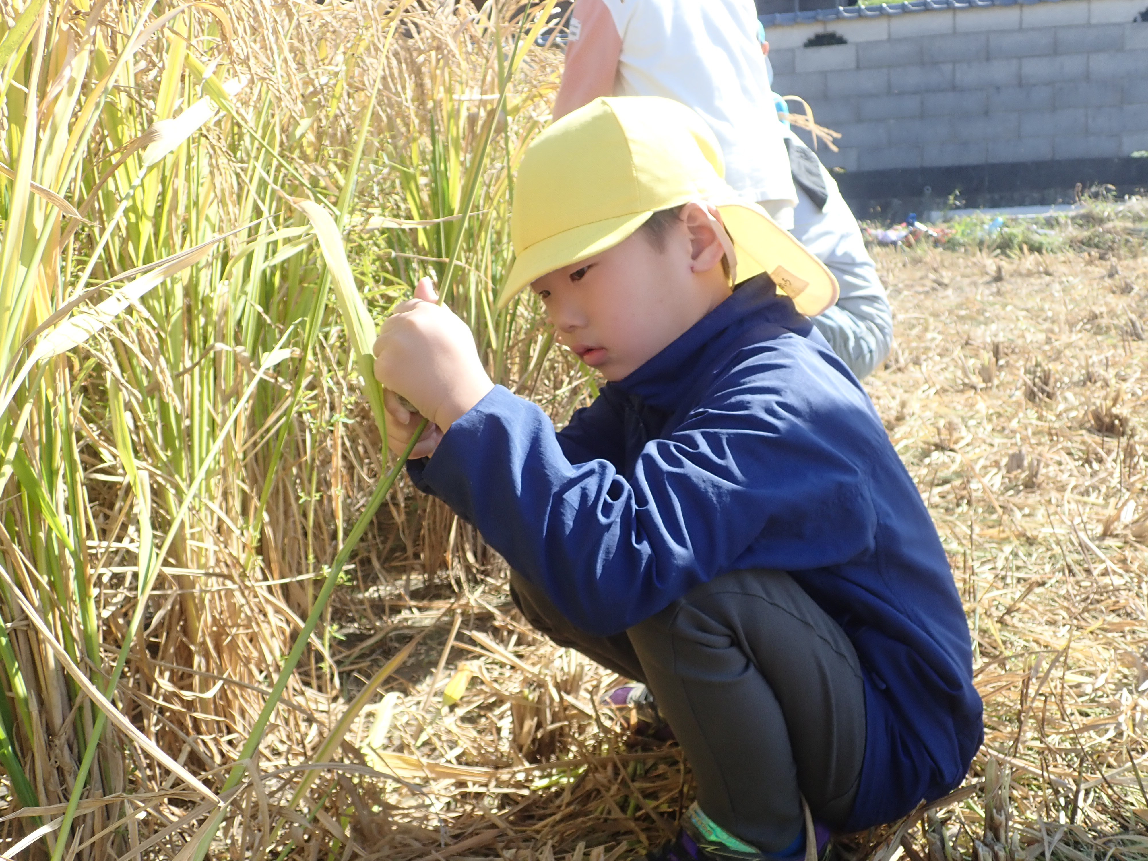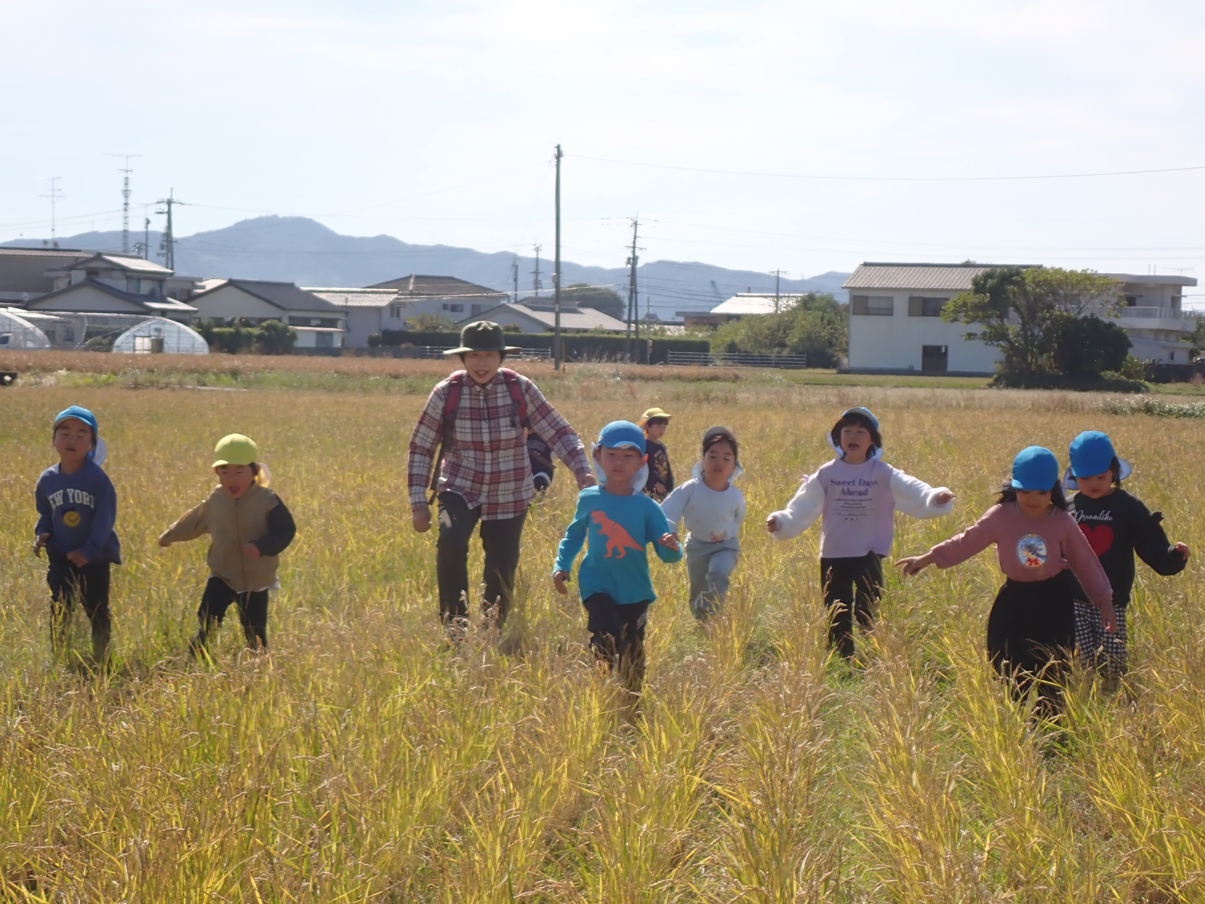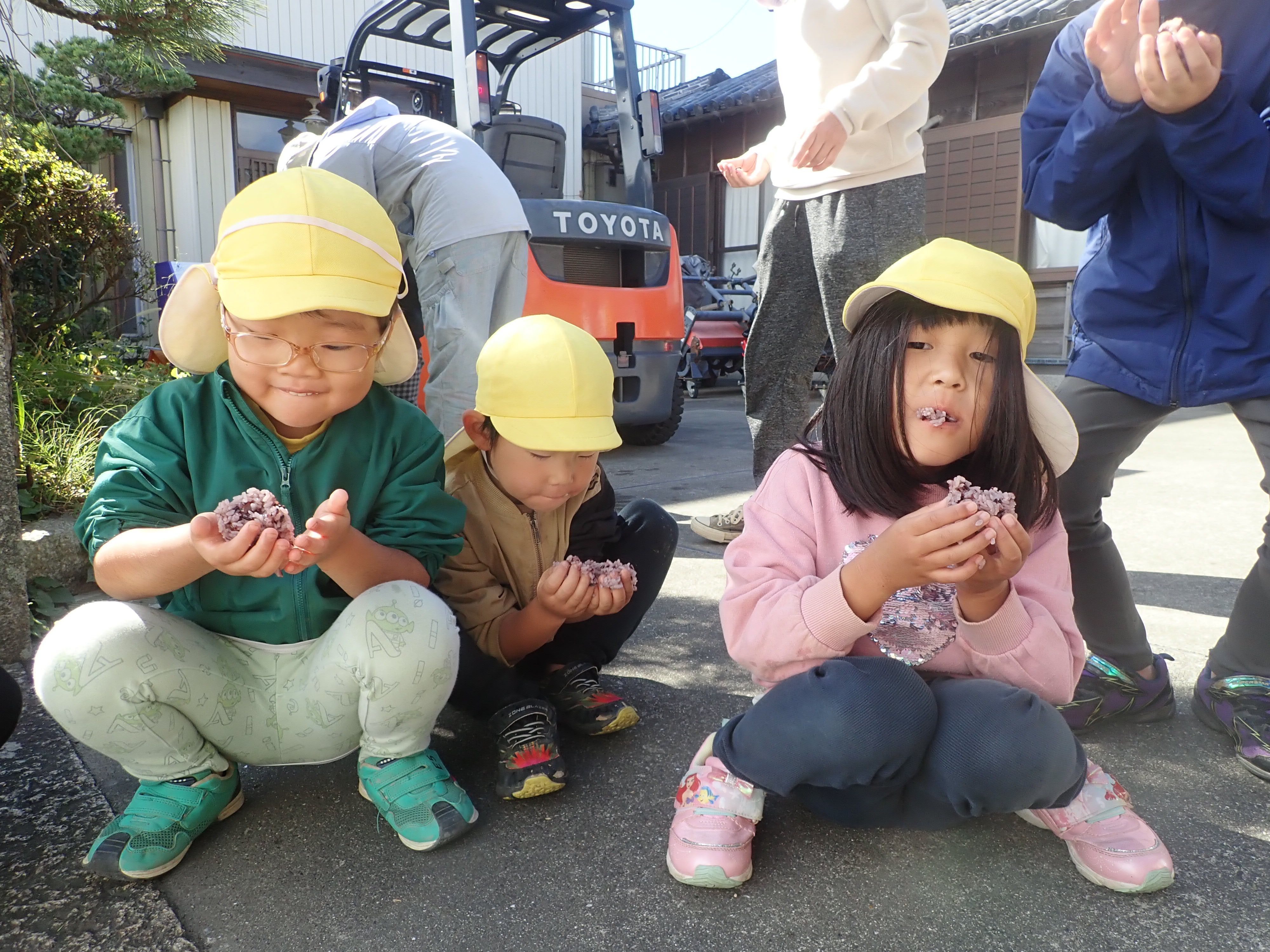 田んぼ泥んこと田植えをした野菊の里で稲刈りをしたよ稲刈りの後は広~い田んぼでヨーイドン!釜で炊いたご飯を炊いてくれまして、自分で握ったおにぎりをパクリ「おいし~い♡」おかわりをする子どもが続出!