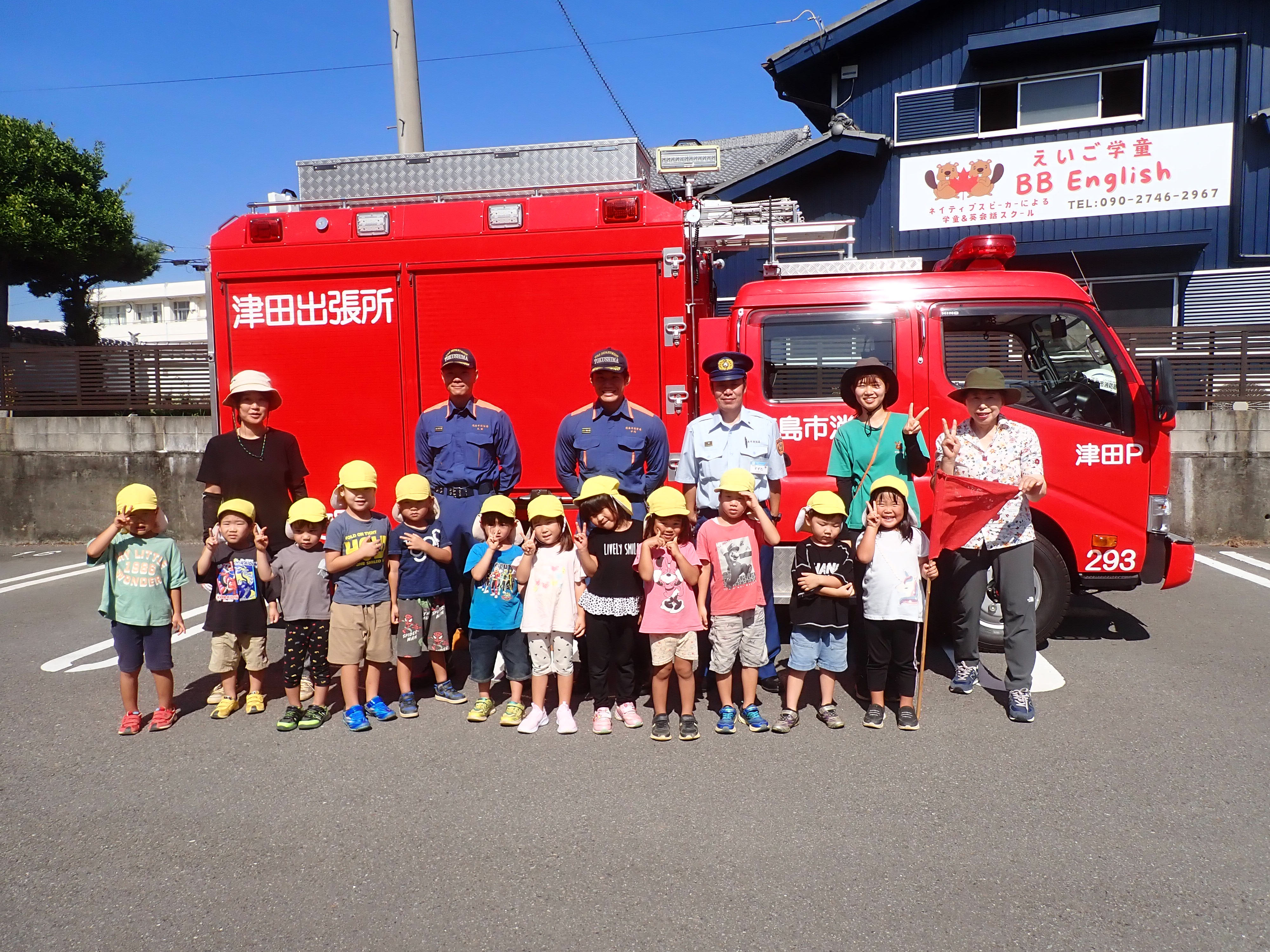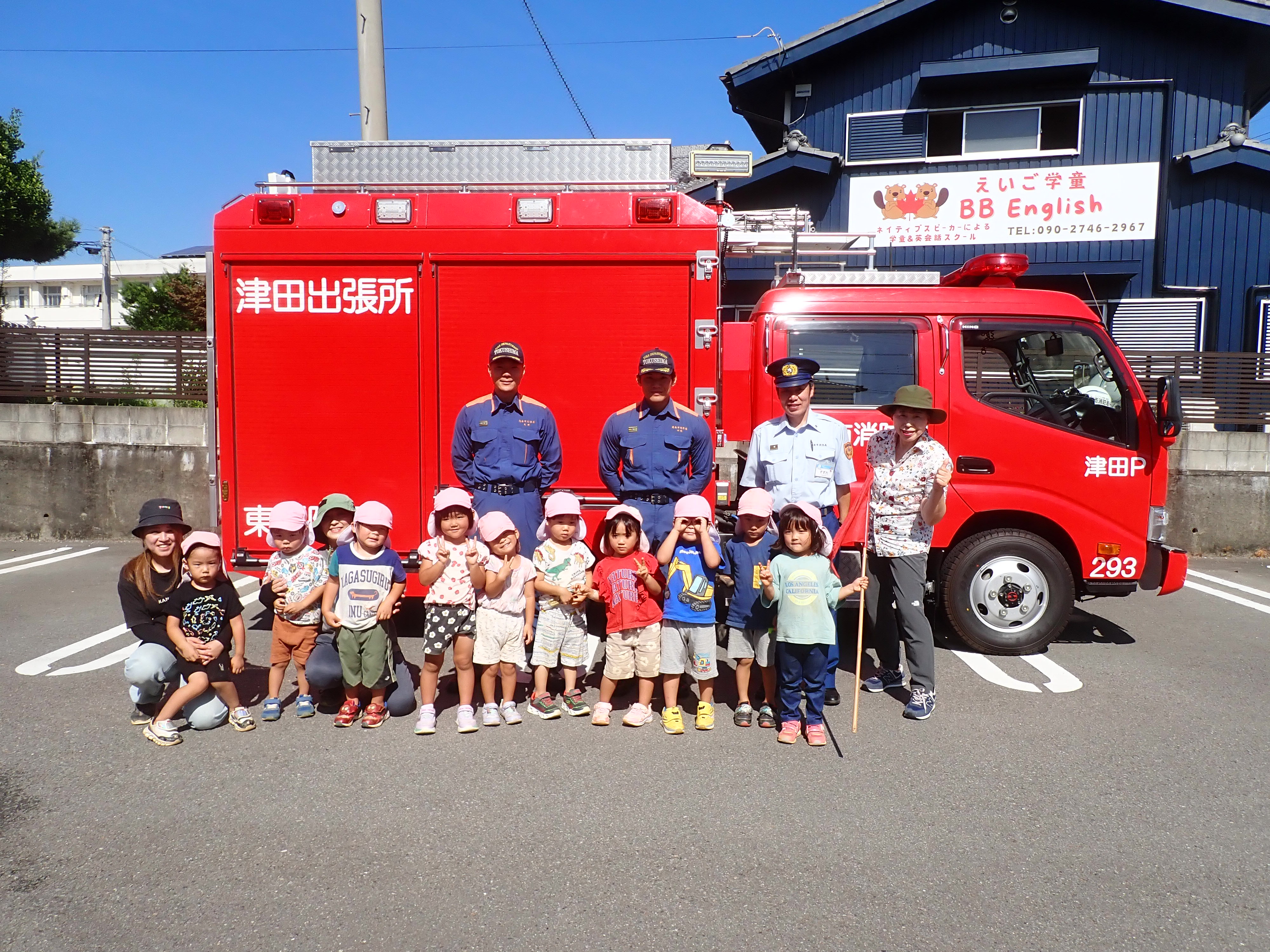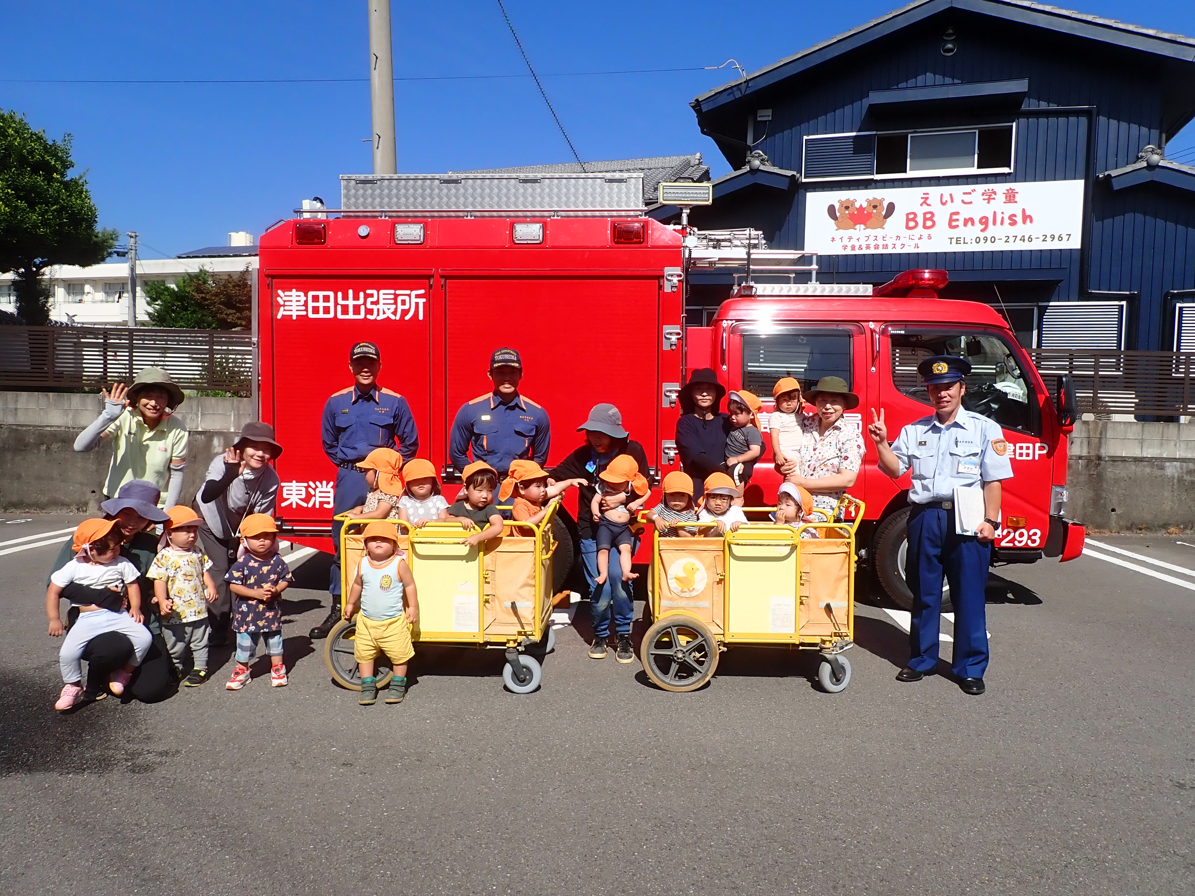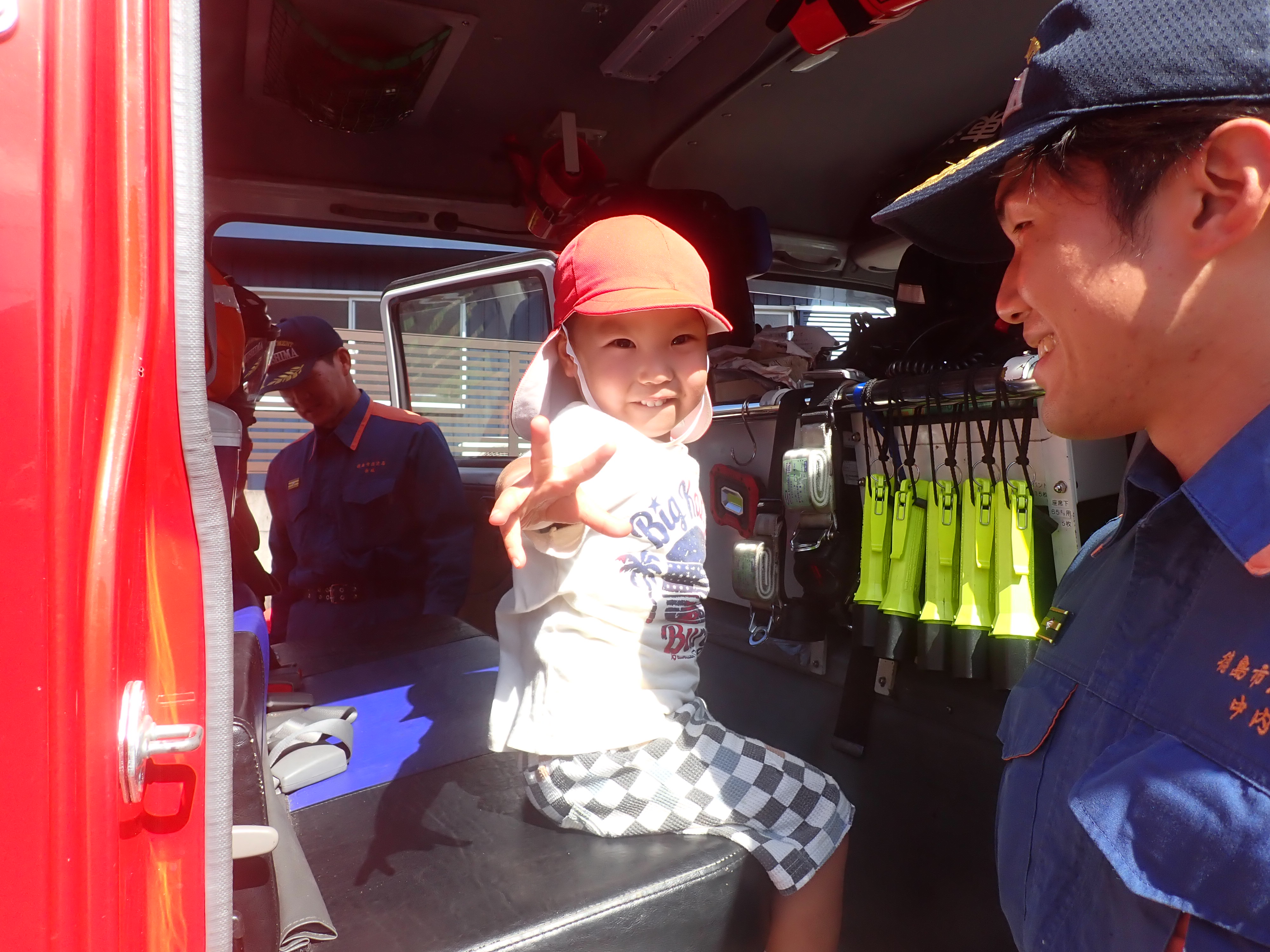 消防士さんによるお話や質問に、子どもたちが大きな声で答えていました。さすが5歳児ぞう組さん!子どもたちの憧れの消防自動車(ポンプ車)の前で写真をパチリ。0,1歳時ひよこ組2歳児りす組3歳児うさぎ組5歳児ぞう組4歳児きりん組実際の火事の現場で活用する防火衣を着てみると、重いこと。消防車に乗せてもらったよ。