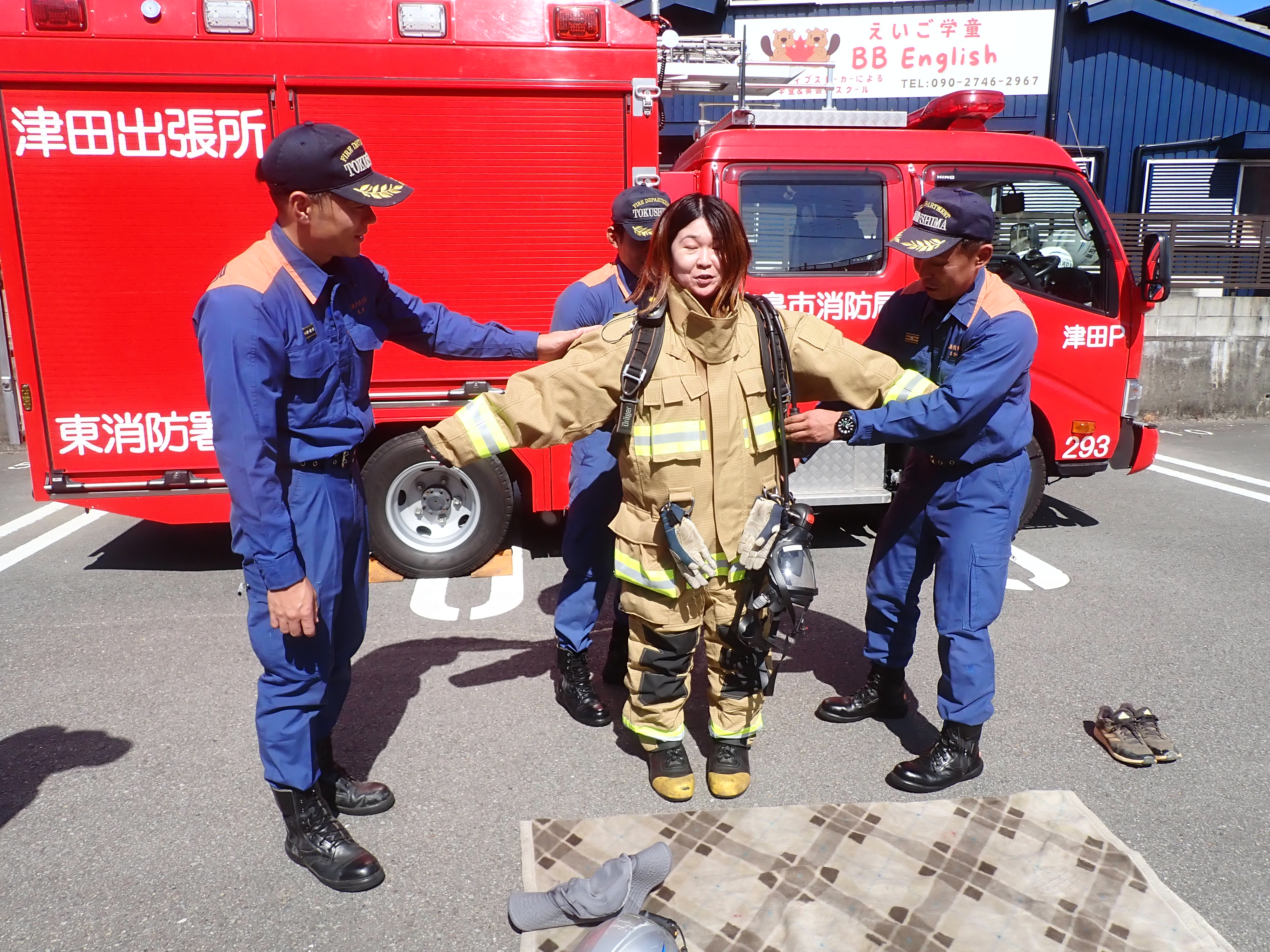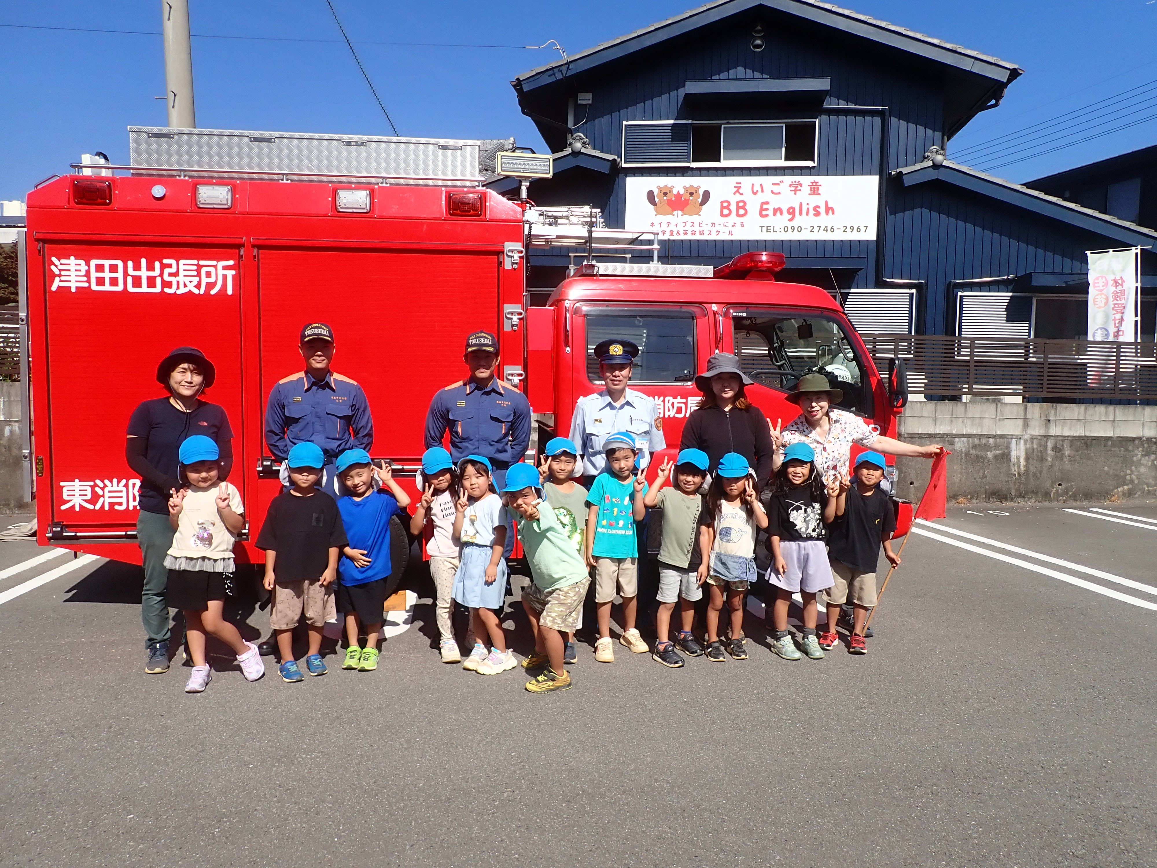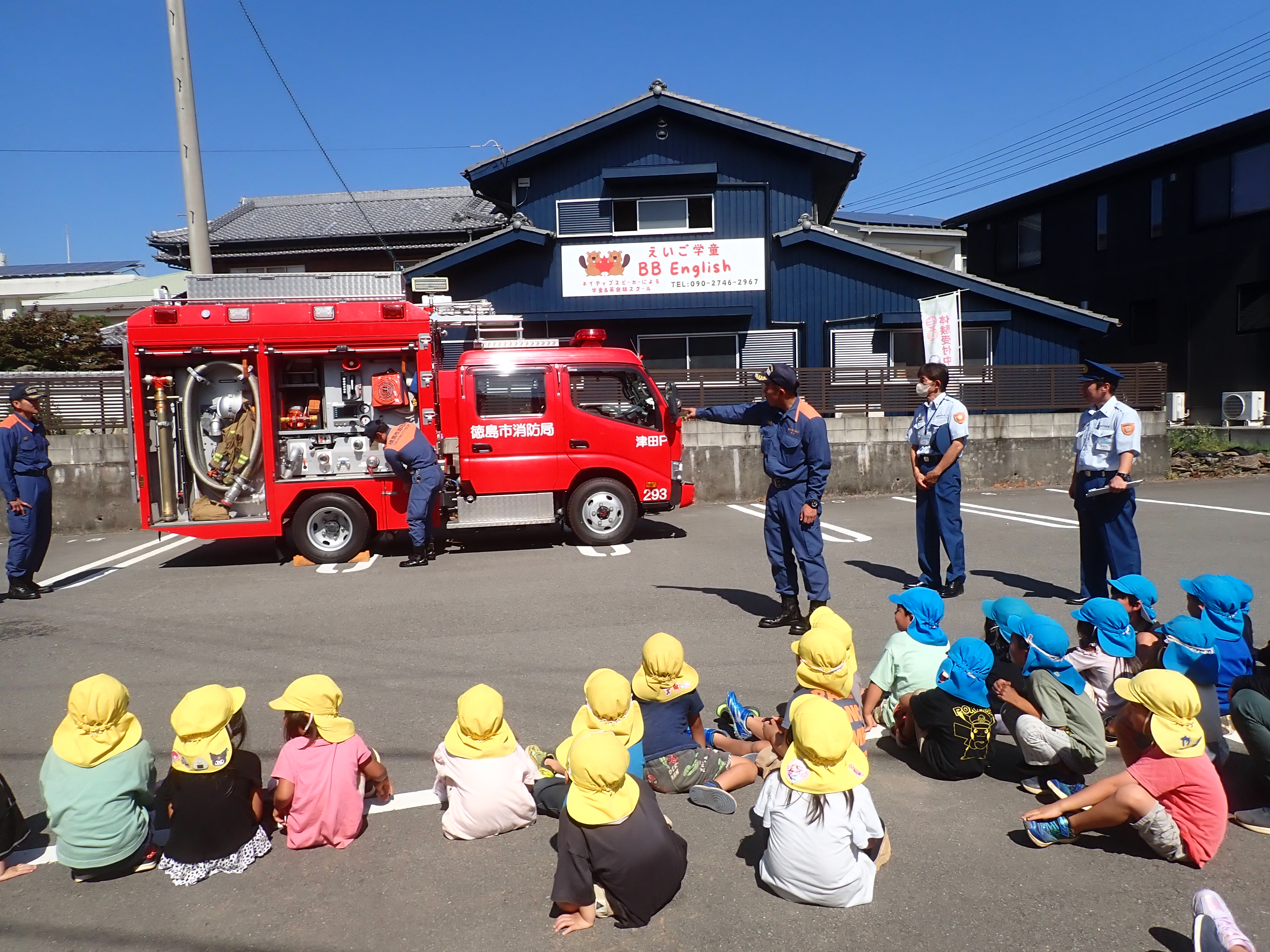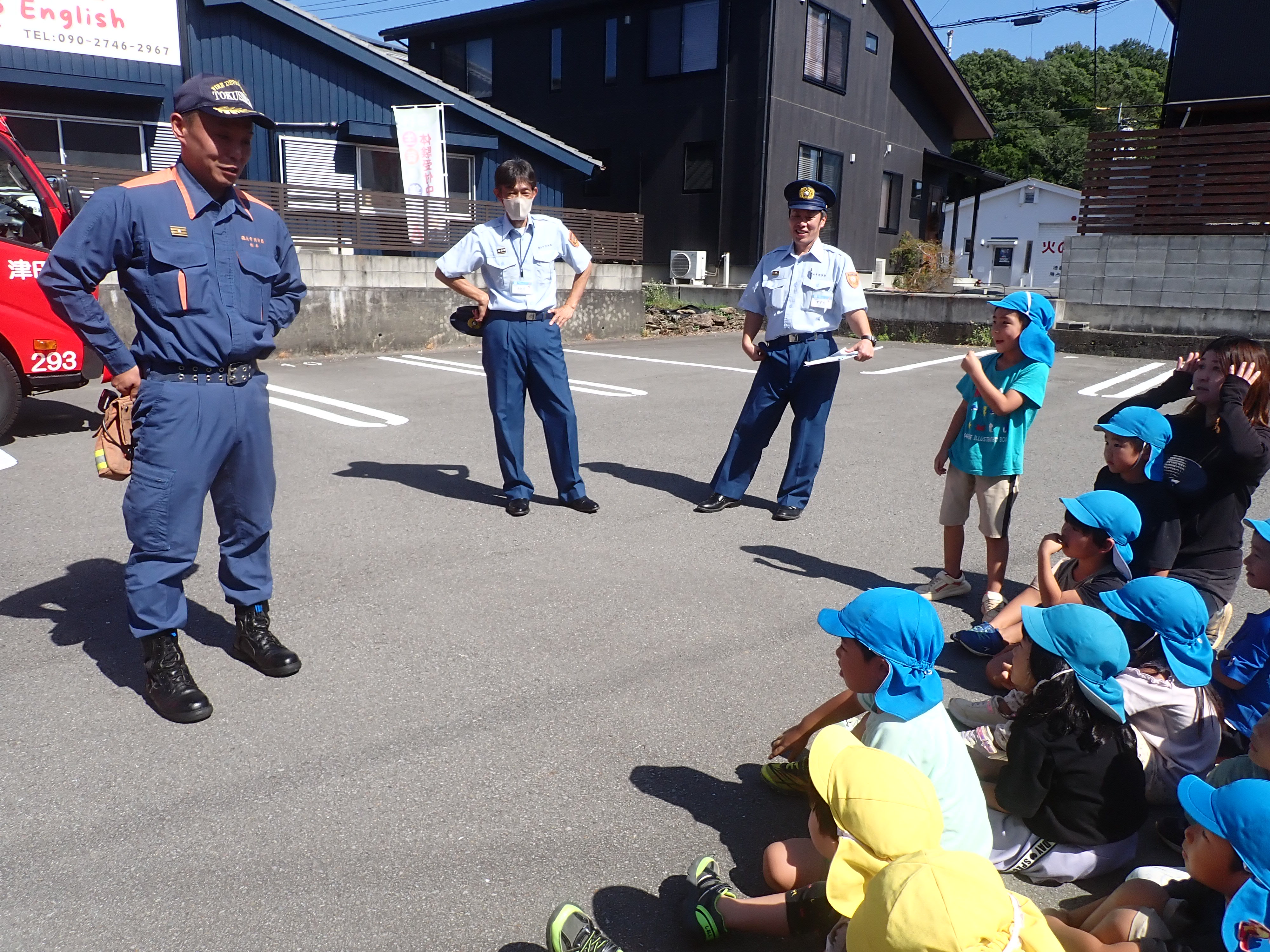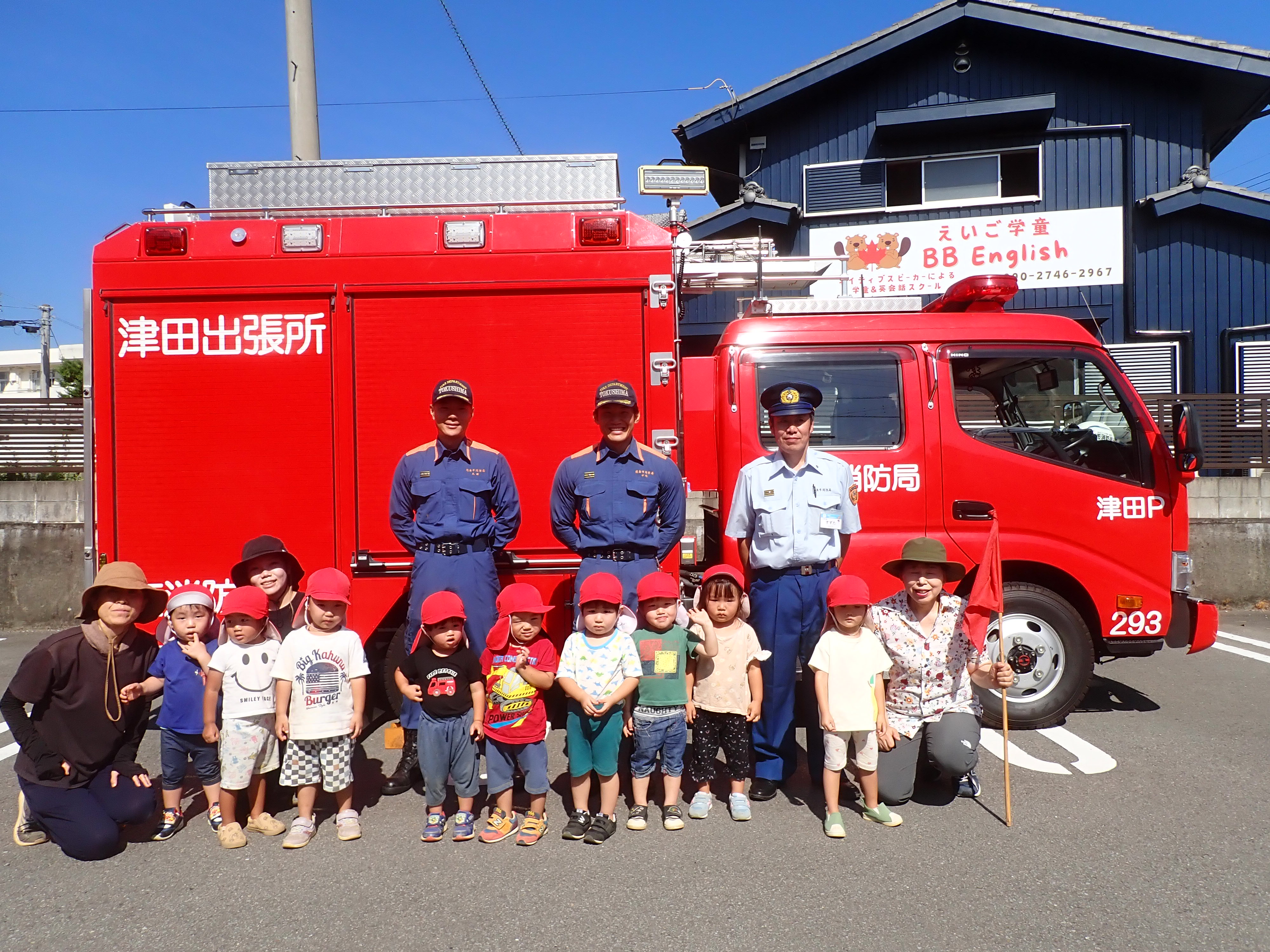 消防士さんによるお話や質問に、子どもたちが大きな声で答えていました。さすが5歳児ぞう組さん!子どもたちの憧れの消防自動車(ポンプ車)の前で写真をパチリ。0,1歳時ひよこ組2歳児りす組3歳児うさぎ組5歳児ぞう組4歳児きりん組実際の火事の現場で活用する防火衣を着てみると、重いこと。消防車に乗せてもらったよ。